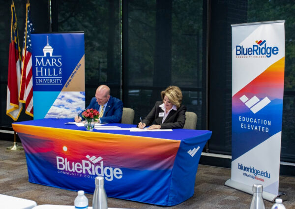Blue Ridge Community College graduates who want to continue their education with a bachelor’s degree now have a direct pathway to do so at Mars Hill University. Mars Hill President Tony Floyd and Blue Ridge President Laura Leatherwood signed paperwork this morning creating the Promise Program: A Direct-Entry Admission Program.