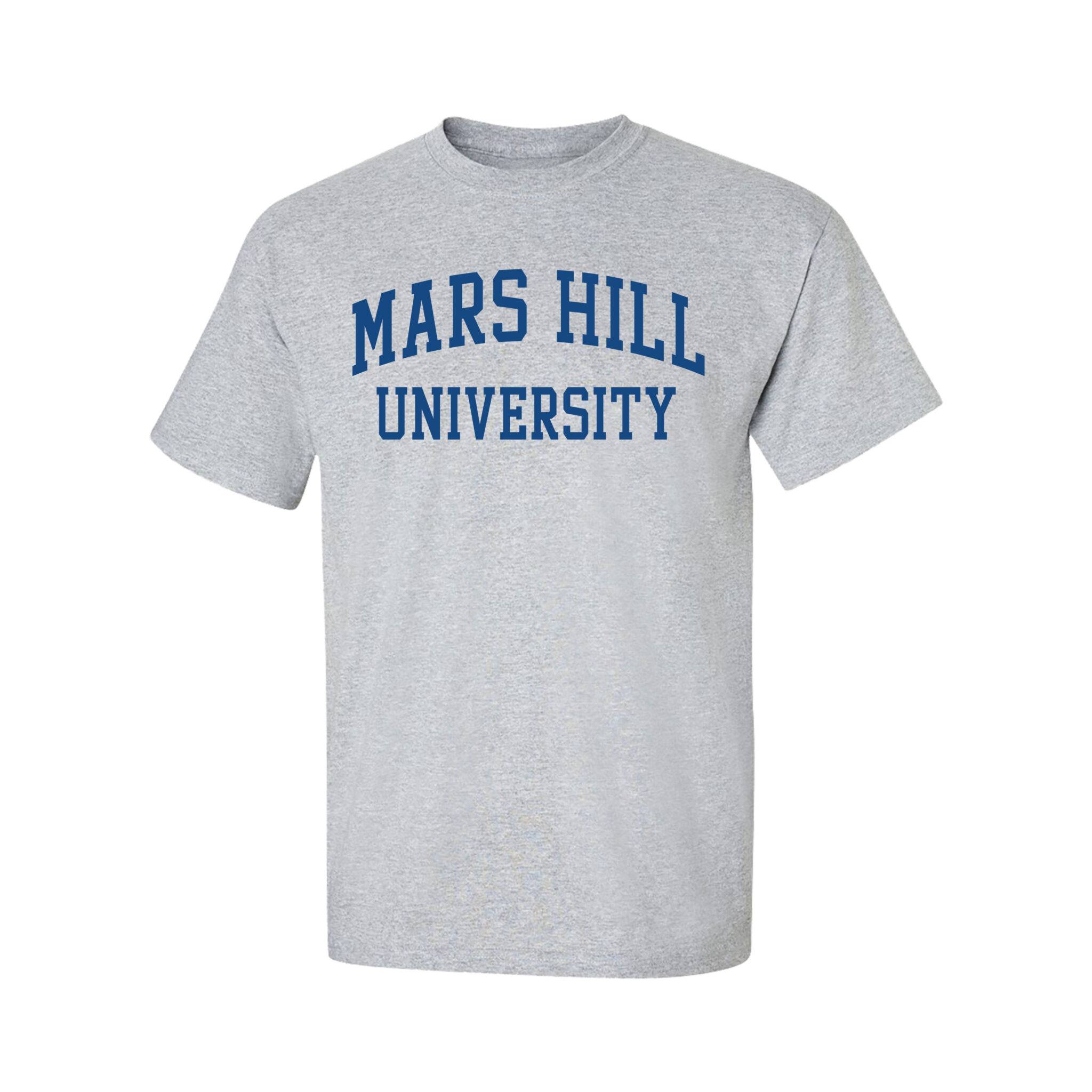 MV SPORT CLASSIC GRAY TEE WITH MARS HILL UNIVERSITY IN BLUE LETTERING